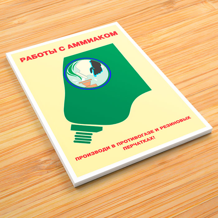 Плакат «Работы с аммиаком производи в противогазе и резиновых перчатках» – хорошее напоминание для тех, чья работа бывает связана с использованием аммиака и других ядовитых и летучих веществ