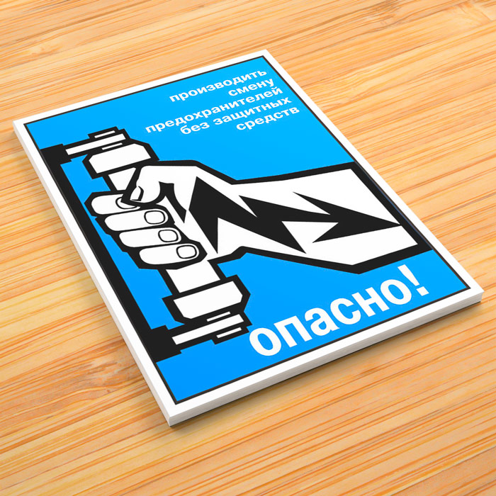 Плакат «Производить смену предохранителей без защитных средств опасно» – яркое напоминание о важности использования средств электрозащиты