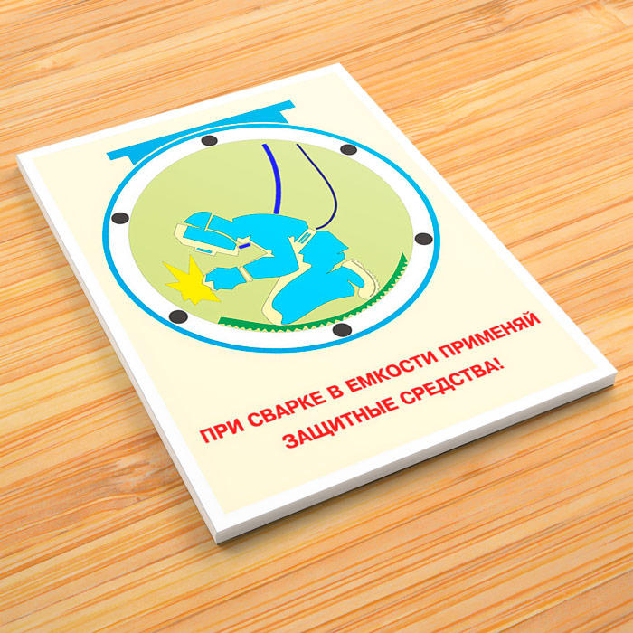 Плакат «При сварке в емкости применяй защитные средства» предназначен для напоминания сварщикам, работающим в емкости, о необходимости использования средств защиты
