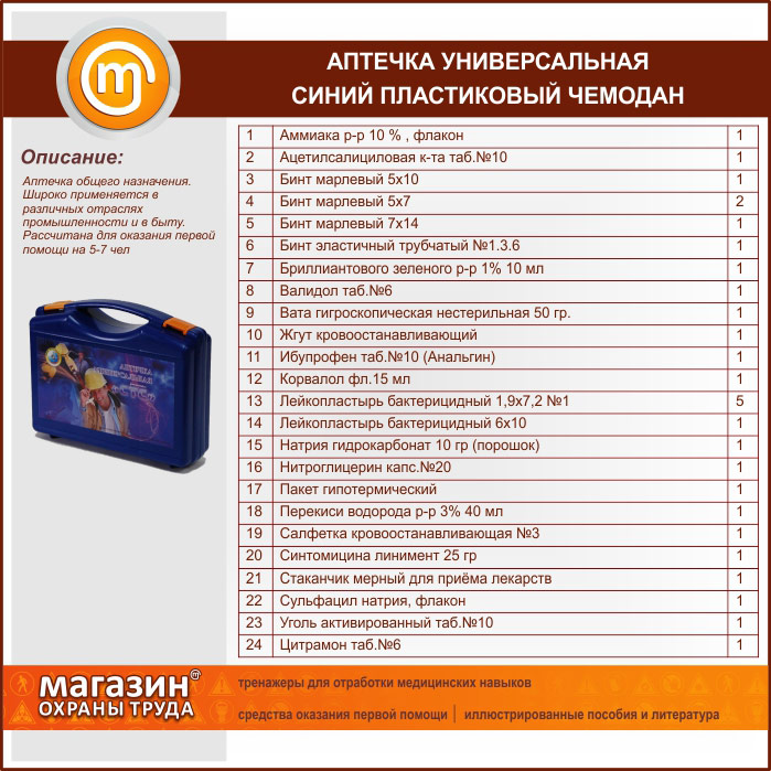 Универсальные аптечки или как их еще называют, аптечки общего назначения, широко применяются в различных отраслях промышленности и в быту. Рассчитаны на оказание первой помощи на 5-7 человек