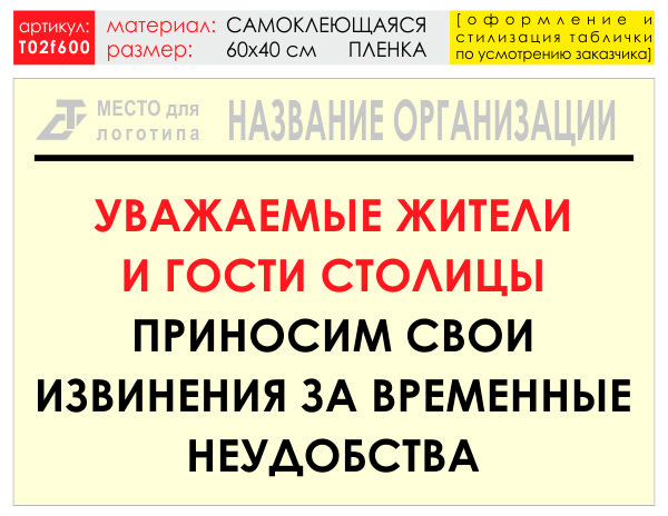 Баннер «Извинения» (T02) может быть изготовен в различных размерах на самоклеящейся плёнке, ПВХ-пластике или баннерной ткани (а также на металле - под заказ) как по нашему, так и по Вашему макету или эскизу. В цену баннера включены: разработка и согласование макета, а также изготовление и упаковка. Изготавливаем таблички любых размеров и на любом материале (включая и металл) по Вашим макетам и эскизам