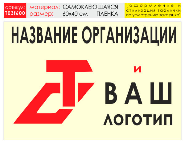 Баннер «Логотип компании» (T03) может быть изготовен в различных размерах на самоклеящейся плёнке, ПВХ-пластике или баннерной ткани (а также на металле - под заказ) как по нашему, так и по Вашему макету или эскизу. В цену баннера включены: разработка и согласование макета, а также изготовление и упаковка. Изготавливаем таблички любых размеров и на любом материале (включая и металл) по Вашим макетам и эскизам