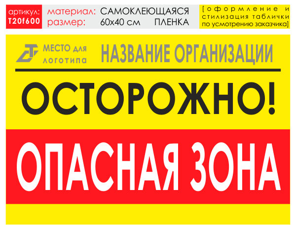 Баннер «Опасная зона» (T20) может быть изготовен в различных размерах на самоклеящейся плёнке, ПВХ-пластике или баннерной ткани (а также на металле - под заказ) как по нашему, так и по Вашему макету или эскизу. В цену баннера включены: разработка и согласование макета, а также изготовление и упаковка. Изготавливаем таблички любых размеров и на любом материале (включая и металл) по Вашим макетам и эскизам