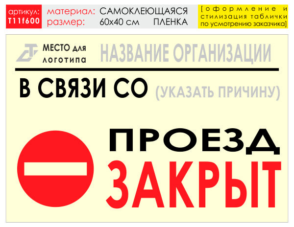 Баннер «Проезд закрыт» (T11) может быть изготовен в различных размерах на самоклеящейся плёнке, ПВХ-пластике или баннерной ткани (а также на металле - под заказ) как по нашему, так и по Вашему макету или эскизу. В цену баннера включены: разработка и согласование макета, а также изготовление и упаковка. Изготавливаем таблички любых размеров и на любом материале (включая и металл) по Вашим макетам и эскизам