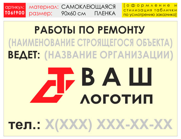 Баннер «Работы по ремонту», T06 на самоклеящейся плёнке, размером 90х60 см