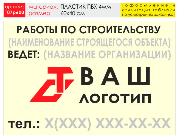 Баннер «Работы по строительству», T07 (пластик 4 мм, 60х40 см)