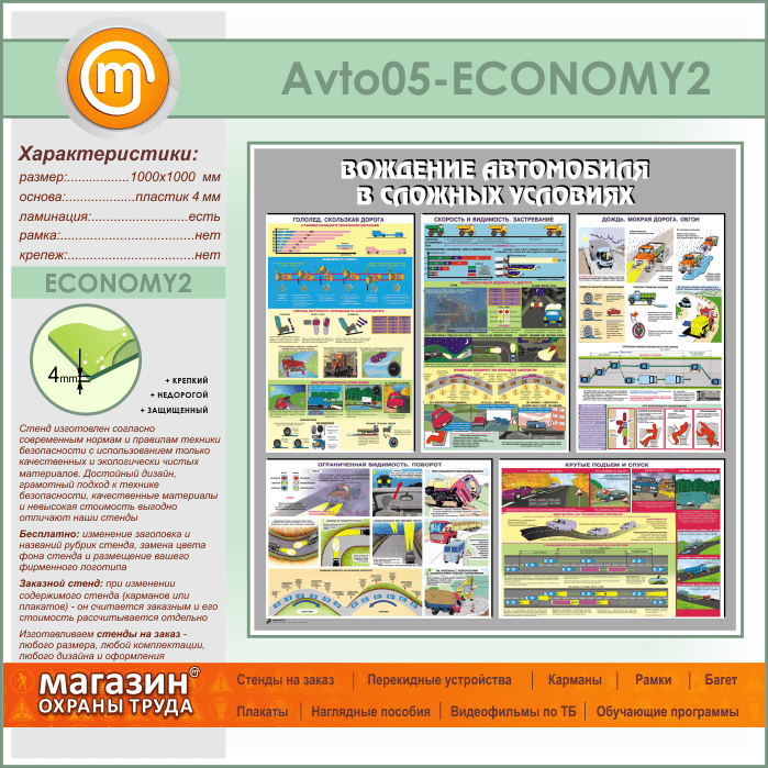 Стенд «Вождение автомобиля в сложных условиях» содержит следующую наглядную информацию о правилах вождения в гололед и на скользкой дороге, о действиях при застревании. Красочная информация о скорости автомобиля в сложных условиях и видимость, как совершать обгон на мокрой и скользкой дороге. Стенд научит, как правильно поворачивать при ограниченной видимости и как вести себя на крутых подъемах и спусках
