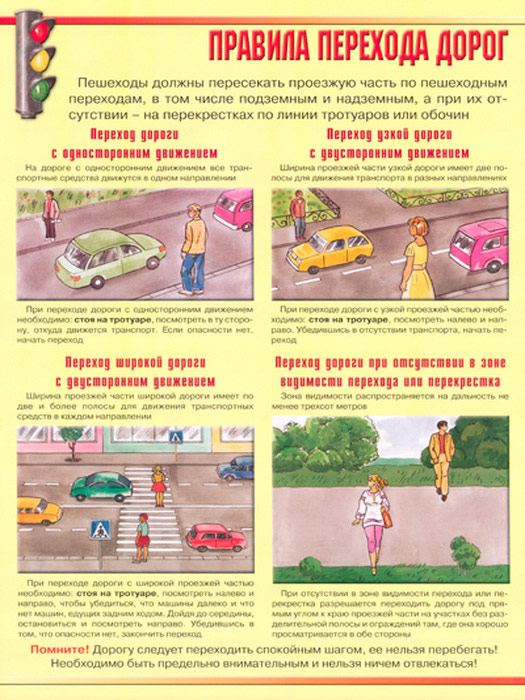 - Плакат «Правила перехода дорог» – переход дороги с односторонним и двусторонним движением, переход при отсутствии в зоне видимости пешеходного перехода или перекрестка