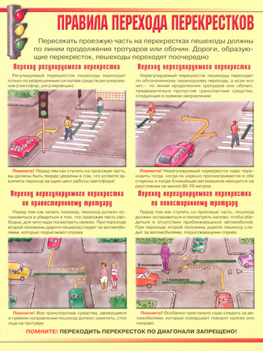 - Плакат «Правила перехода перекрестков» – переход регулируемого и нерегулируемого перекрестка, переход перекрестков по тротуару