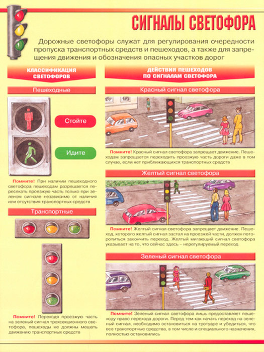 - Плакат «Сигналы светофора» – классификация светофоров, действия пешеходов по сигналам светофора