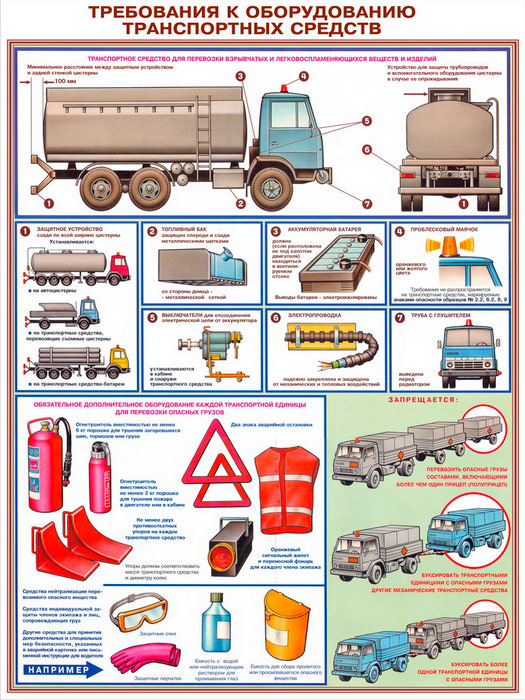 - Плакат «Требования к оборудованию транспортных средств» – ТС для перевозки взрывчатых и легковоспламеняющих веществ, оборудование и дополнительное оборудование, правила перевозки