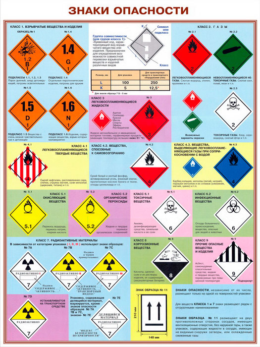 - Плакат «Знаки опасности» – виды маркировки опасных грузов и классы опасности