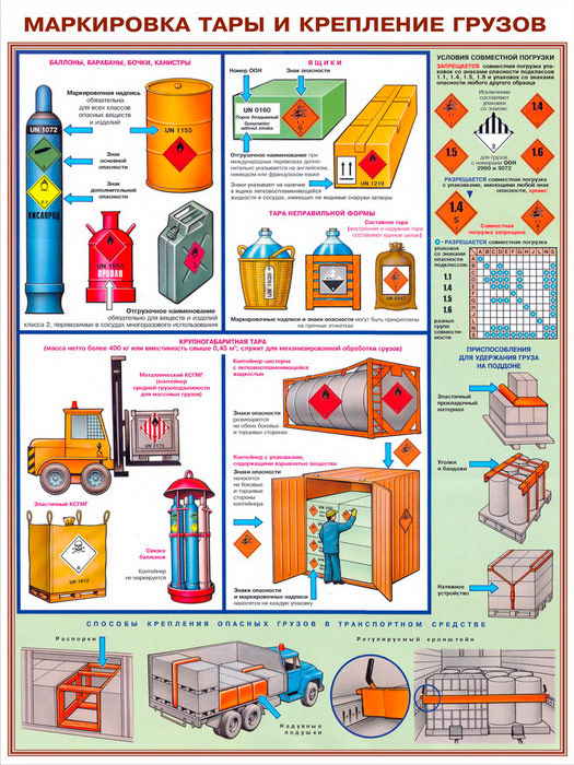 - Плакат «Маркировка тары и крепление грузов» – маркировка баллонов, ящиков, крупногабаритной тары, условия совместной перевозки и способы крепления