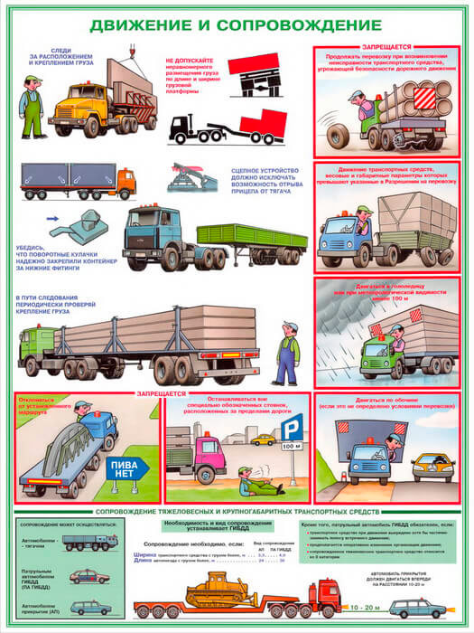 - Плакат «Движение и сопровождение» – правила расположения и перевозки груза, сцепное устройство и параметры груза для сопровождения