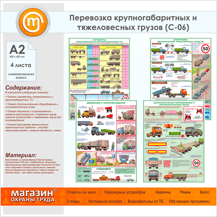 Плакаты «Перевозка крупногабаритных и тяжеловесных грузов» (С-06, ламинированная бумага, А2, 4 листа)