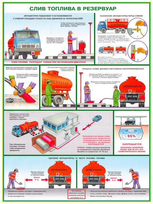 - Плакат «Слив топлива в резервуар» – порядок и процесс слива, заземление цистерны, пролив топлива