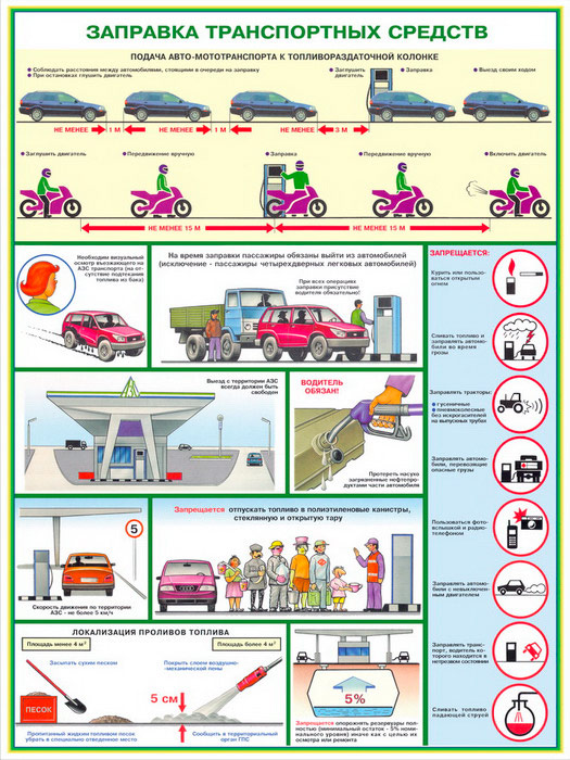 - Плакат «Заправка транспортных средств» – подача транспорта к колонке, обязанности водителя, техника безопасности, локализация пролива топлива