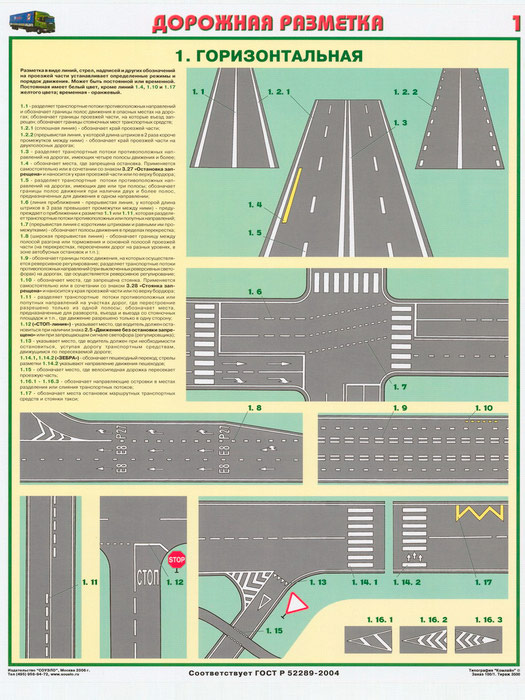 - Плакат «Горизонтальная разметка» – виды разметки и надписи