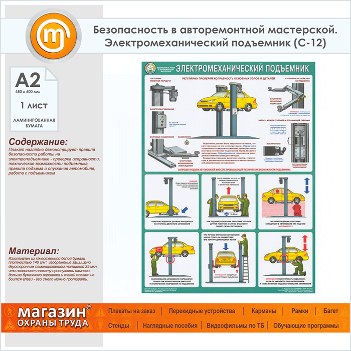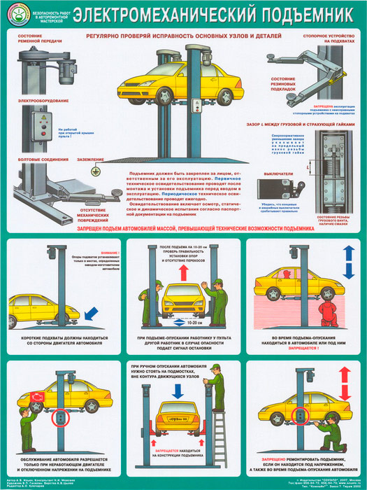 Плакат «Безопасность в авторемонтной мастерской. Электромеханический подъемник» – достойное качество и полезная информация по приемлемой цене
