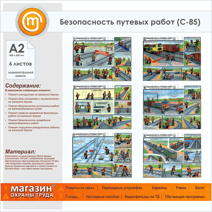 Плакаты «Безопасность путевых работ» (С-85, ламинированная бумага, А2, 6 листов)