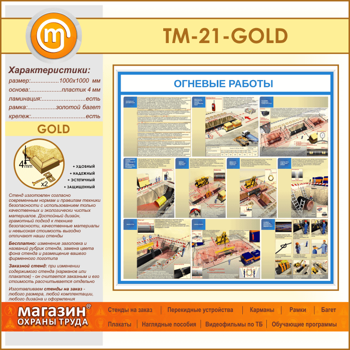 Стенд с информацией по безопасности проведения огневых работ – это наглядная информация по безопасности при организации участка производства работ и установке временных герметизаторов. Стенд содержит информацию по освобождению участка газопровода от газа с применением вентиляторных установок, по вырезке дефектных участков и их демонтажу, очистка труб и подготовка кромок, сборке труб и сварке стыков, приведены примеры нарушений безопасного ведения работ. и правильного оформления документации
