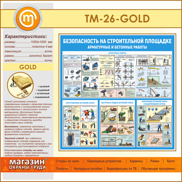 Стенд «Безопасность на строительной площадке. Арматурные и бетонные работы» (TM-26-GOLD)