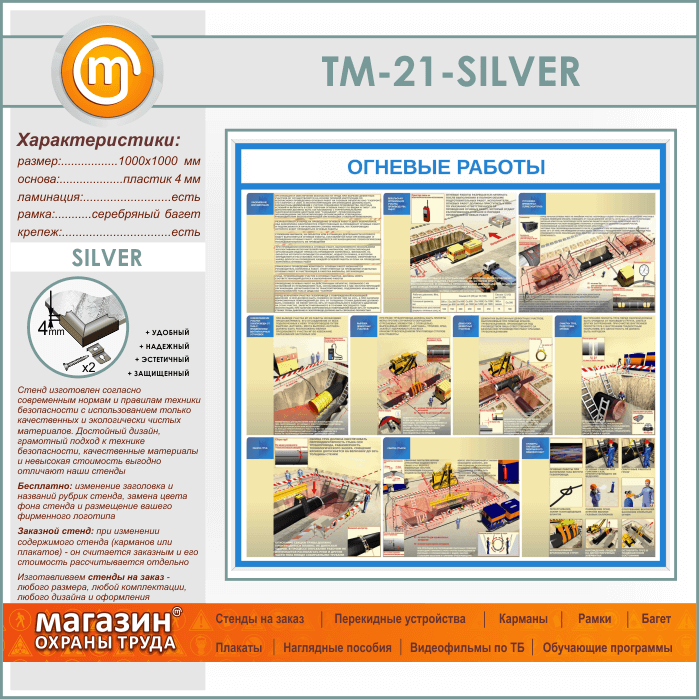 Стенд с информацией по безопасности проведения огневых работ – это наглядная информация по безопасности при организации участка производства работ и установке временных герметизаторов. Стенд содержит информацию по освобождению участка газопровода от газа с применением вентиляторных установок, по вырезке дефектных участков и их демонтажу, очистка труб и подготовка кромок, сборке труб и сварке стыков, приведены примеры нарушений безопасного ведения работ. и правильного оформления документации