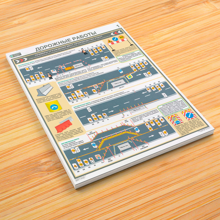Комплект плакатов «Дорожные работы. Правила охраны труда» из 3 листов содержит примеры ограждения мест производства работ различными типами ограждений (железобетонными блоками, буфер-тумбами, водоналивными блоками и т.д.)