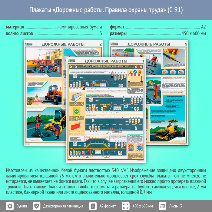 Плакаты «Дорожные работы. Правила охраны труда» (С-91, ламинированная бумага, А2, 3 листа)