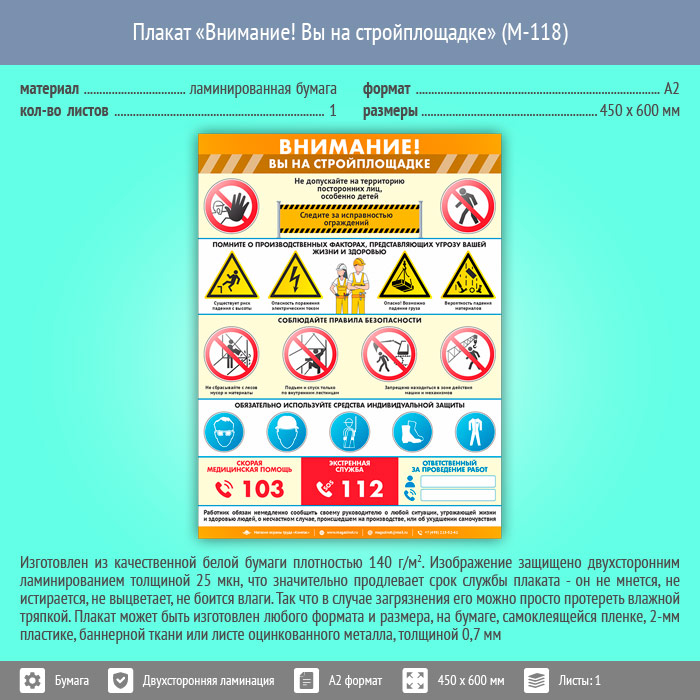 Плакат «Внимание! Вы на стройплощадке» напоминает о соблюдении важнейших правил поведения на стройплощадке - недопускания на территорию посторонних лиц, о самых опасных производственных факторах, о необходимости соблюдении правил безопасности и использования СИЗ, а также содержит телефоны скорой помощи и эстренной службы