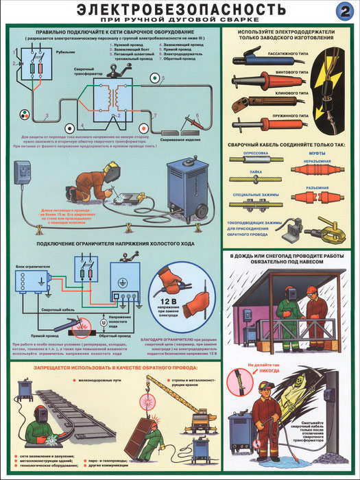 - Плакат «Электробезопасность при ручной дуговой сварке» – оборудование и правила выполнения работ