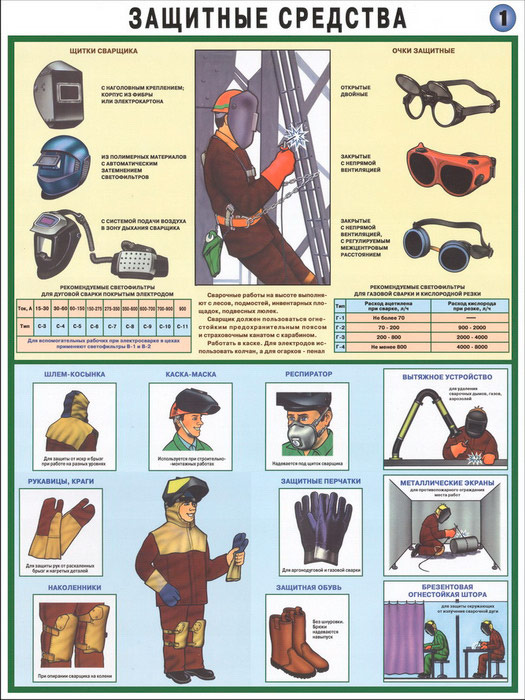 - Плакат «Защитные средства» – щитки, очки, каски, респираторы, защита тела рук и ног