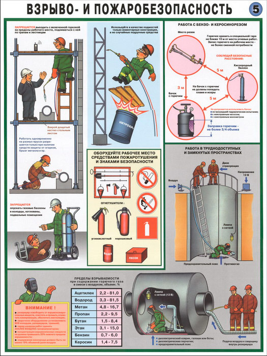 - Два плаката по взрыво- и пожаробезопасности – организация рабочего места, соблюдение расстояний, работа с бензорезом, безопасность работ в труднодоступных и замкнутых местах, к чему приводит нарушение техники безопасности