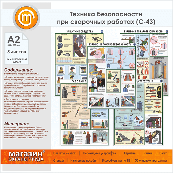 Плакаты «Техника безопасности при сварочных работах» (С-43, ламинированная бумага, А2, 5 листов)