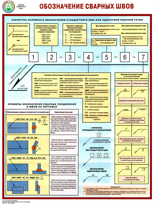 Плакат «Обозначение сварных швов» содержит структуру условного обозначения стандартного шва или одиночной сварной точки и примеры обозначений сварных соединений и швов на чертежах