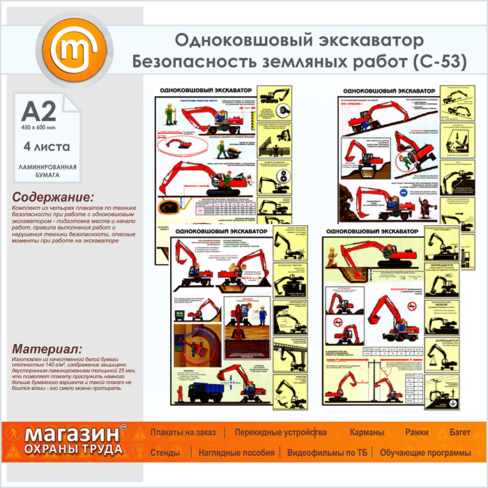 Плакаты «Одноковшовый экскаватор. Безопасность земляных работ» (С-53, ламинированная бумага, А2, 4 листа)