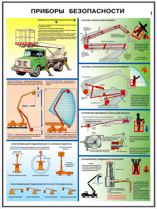 - Плакат «Приборы безопасности» – система ориентации люльки и ограничения зоны обслуживания, устройство аварийного опускания люльки и ограничитель предельного груза, классификация подъемников