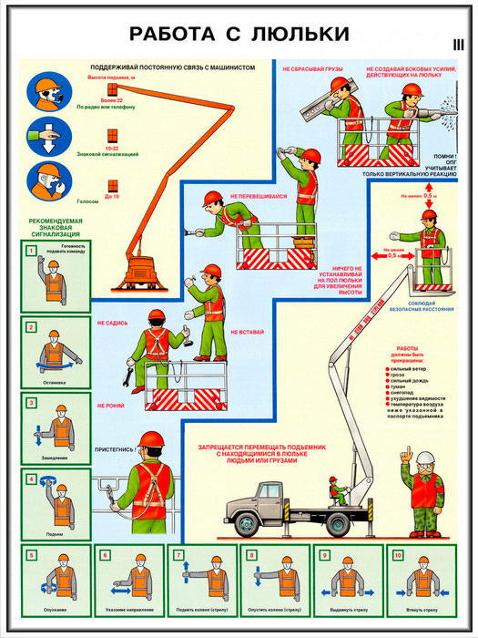 - Плакат «Работа с люльки» – знаковая сигнализация и техника безопасности работ на высоте