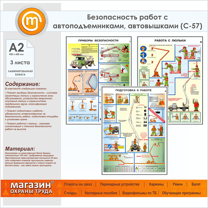 Плакаты «Безопасность работ с автоподъемниками, автовышками» (С-57, ламинированная бумага, А2, 3 листа)