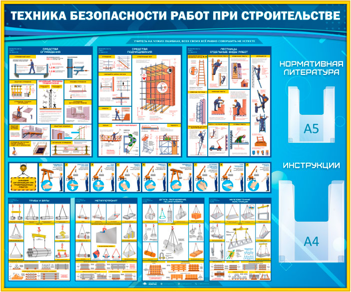 Стенд «Техника безопасности при строительстве» – это схемы строповки и складирования грузов, знаковая сигнализация и грузозахватные приспособления, средства ограждения и средства подмащивания, предохранительные пояса, лестницы и отдельные виды работ на высоте, объемные карманы для самостоятельной комплектации стенда учебным материалом – А5 – для нормативной литературы, А4 – для инструкций…