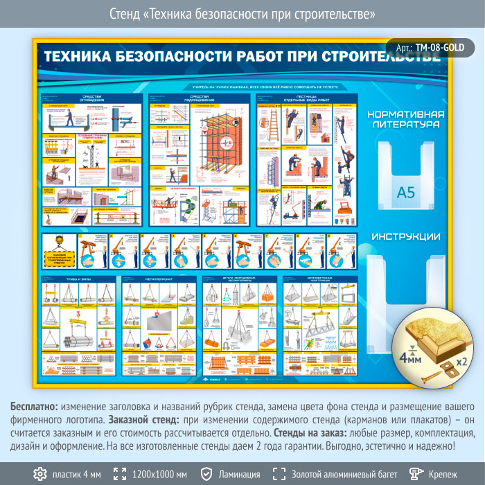Стенд «Техника безопасности при строительстве» с 2 объемными карманами (TM-08-GOLD)