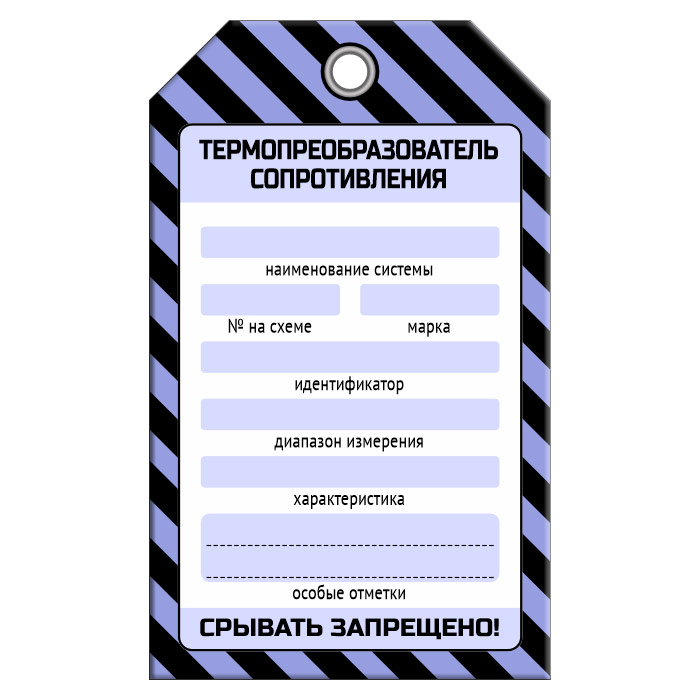 Бирка «ТЕРМОПРЕОБРАЗОВАТЕЛЬ СОПРОТИВЛЕНИЯ» (1 шт.) изготавливается из пластика 0,3 мм, либо металла. Пластиковый вариант имеет полноцветную двустороннюю печать и размер 70х115 мм. Для дополнительной защиты от факторов окружающей среды возможно ламинирование поверхности. Металлическая бирка изготавливается в двух размерах - 70х115 мм и 50х80 мм. Изображение печатается УФ чернилами.