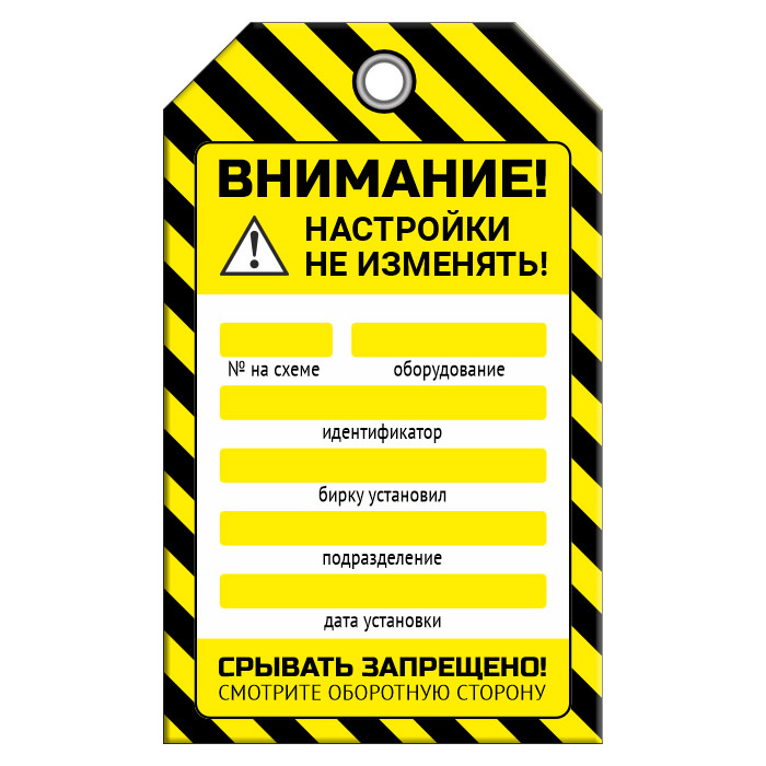 Бирка «НАСТРОЙКИ НЕ ИЗМЕНЯТЬ!» размером 70х115 мм имеет полноцветную двустороннюю печать. Для дополнительной защиты от факторов окружающей среды возможно ламинирование поверхности