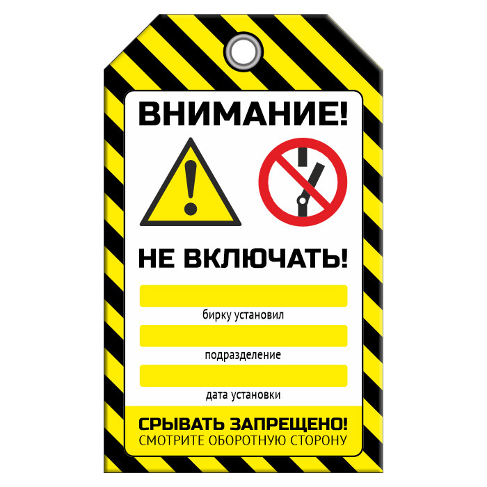 Бирка «НЕ ВКЛЮЧАТЬ!», 2-й вариант размером 70х115 мм имеет полноцветную двустороннюю печать. Для дополнительной защиты от факторов окружающей среды возможно ламинирование поверхности