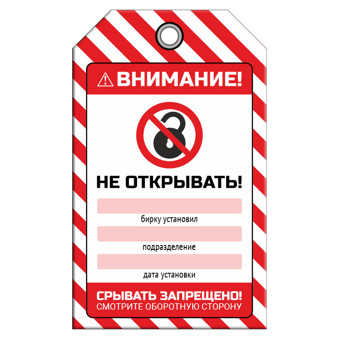 Бирка «НЕ ОТКРЫВАТЬ!» размером 70х115 мм имеет полноцветную двустороннюю печать. Для дополнительной защиты от факторов окружающей среды возможно ламинирование поверхности