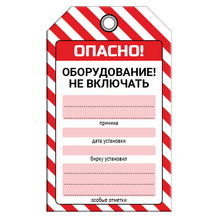 Бирка «ОБОРУДОВАНИЕ НЕ ВКЛЮЧАТЬ!» размером 70х115 мм имеет полноцветную двустороннюю печать. Для дополнительной защиты от факторов окружающей среды возможно ламинирование поверхности