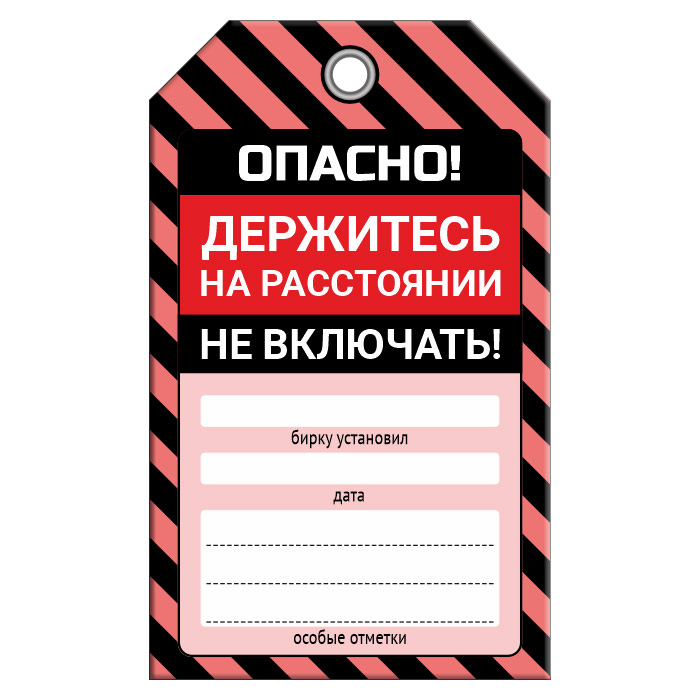 Бирка «ОПАСНО! НЕ ВКЛЮЧАТЬ!» размером 70х115 мм имеет полноцветную двустороннюю печать. Для дополнительной защиты от факторов окружающей среды возможно ламинирование поверхности