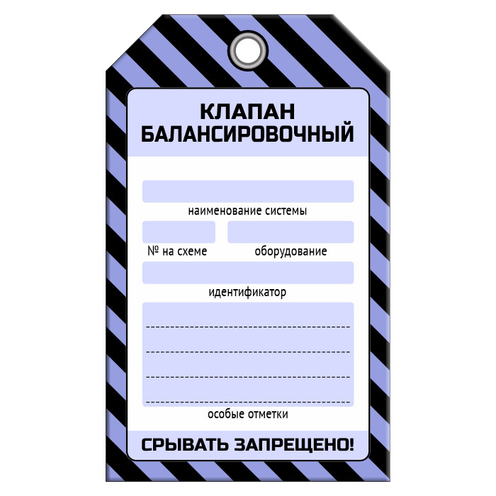 Бирка «КЛАПАН БАЛАНСИРОВОЧНЫЙ» размером 70х115 мм имеет полноцветную односторонюю печать. Для дополнительной защиты от факторов окружающей среды возможно ламинирование поверхности