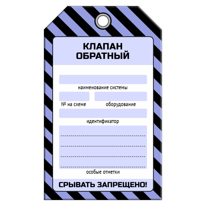 Бирка «КЛАПАН ОБРАТНЫЙ» размером 70х115 мм имеет полноцветную односторонюю печать. Для дополнительной защиты от факторов окружающей среды возможно ламинирование поверхности