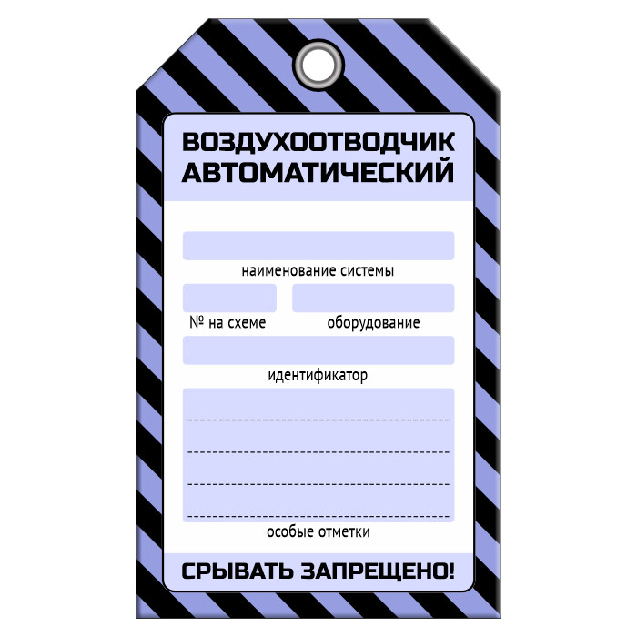 Бирка «ВОЗДУХООТВОДЧИК АВТОМАТИЧЕСКИЙ» размером 70х115 мм имеет полноцветную односторонюю печать. Для дополнительной защиты от факторов окружающей среды возможно ламинирование поверхности
